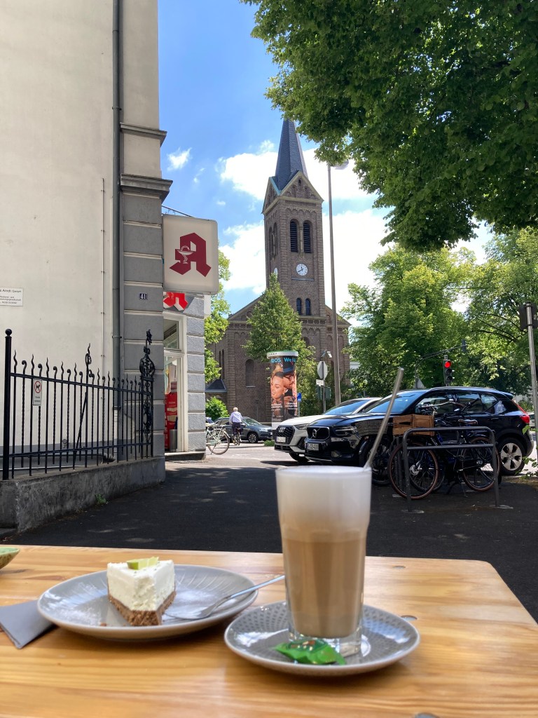 July 8. My day started around 10. I’d finally fallen asleep in the early morning. I guess you can adjust to any noise. Aziz had agreed to let me cancel the second night since I couldn’t sleep, and I thanked him and headed out. I found a cozy café called Lindenbaum, and had an excellent key lime pie and a double-shot macchiato. The staff were friendly and recommended some places to check out, including recommending that I get a €9 ticket that would let me ride regional trains all across Germany for a month. It was an incentive being offered during Covid. I thought, why not? So I headed to the nearest train station and bought one.
