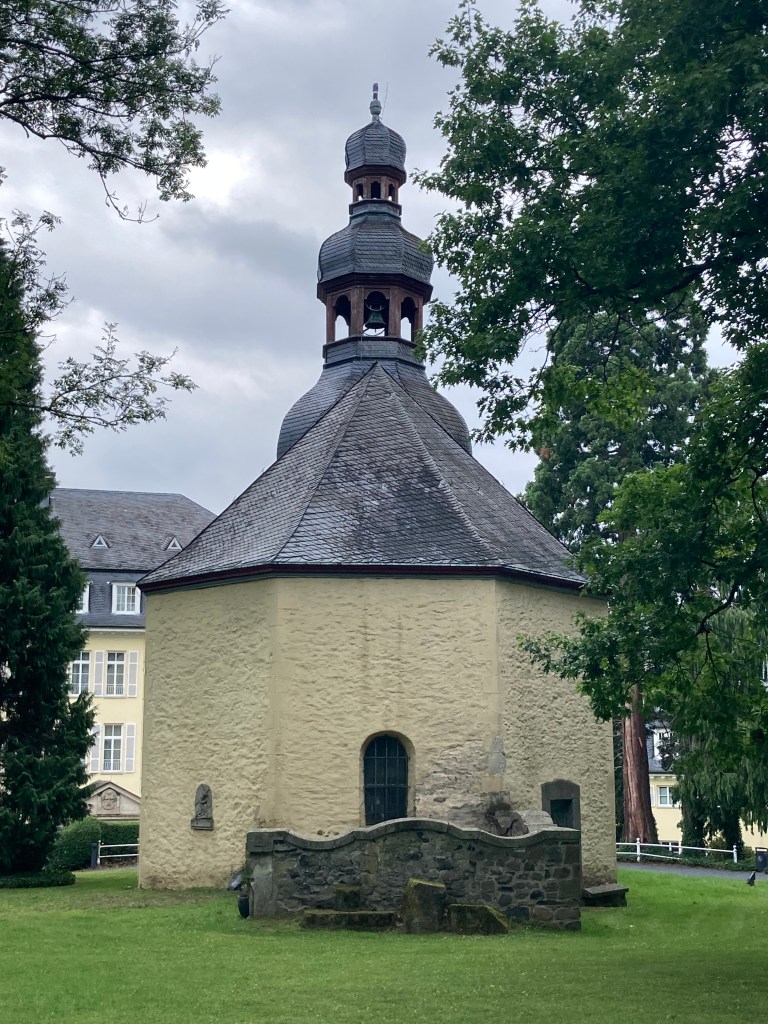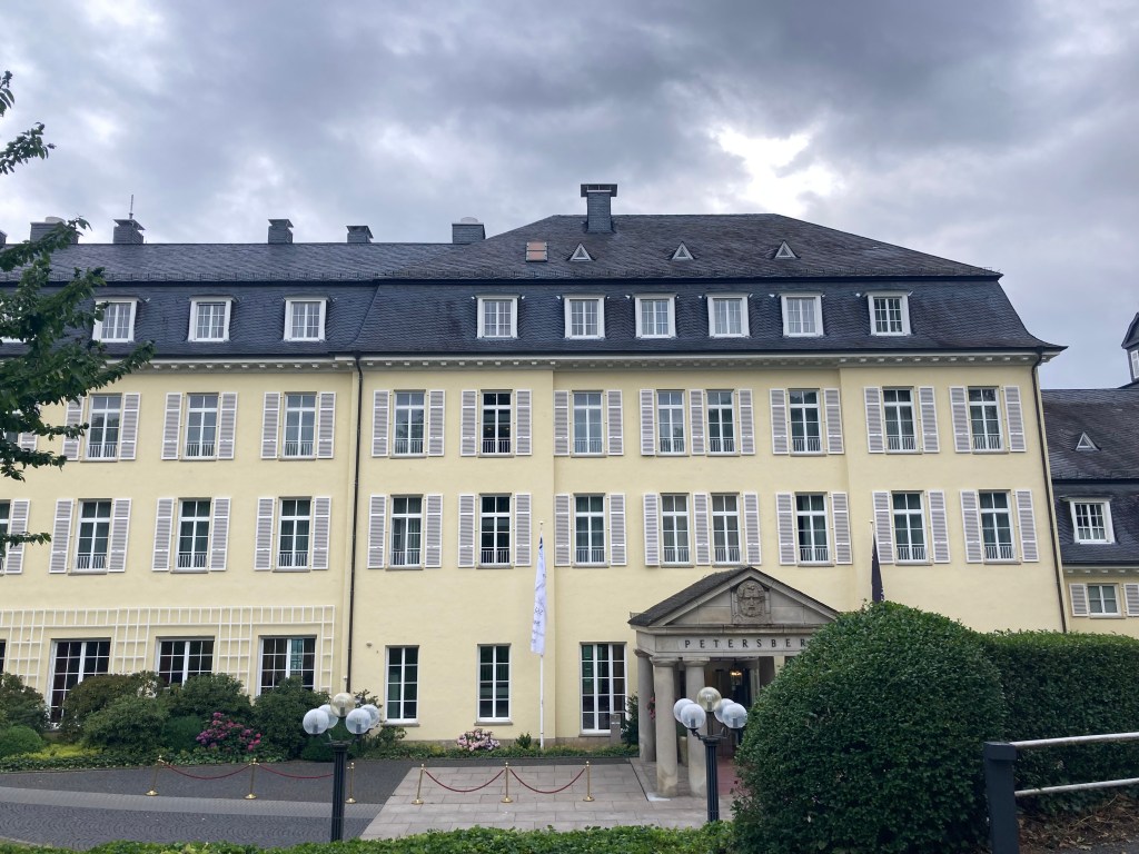 Afterwards, I wandered through town, admiring the old buildings and walking along the lovely promenade. It’s easy to see why wealthy folks built stately residences here—it’s gorgeous. Then I drove up to the grand Hotel Petersberg on the mountain and walked around a bit. There’s a chapel there, St. Peter’s, that dates back to when Cistercian monks had an abbey here. The ruins are still a big pilgrimage site.