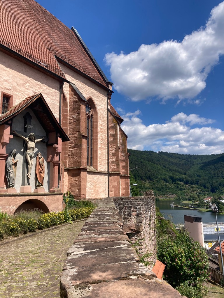 Next, I headed back to Hirschhorn to hoping to learn more about its history. I had coffee roasting place. The coffee was good—not great—and I set off on the walking history tour. I learned quite a bit along the way, and especially enjoyed the cloister church, which was impressive with its baroque artwork. It was fun walking up the hill to see the city walls, still intact and quite beautiful.
