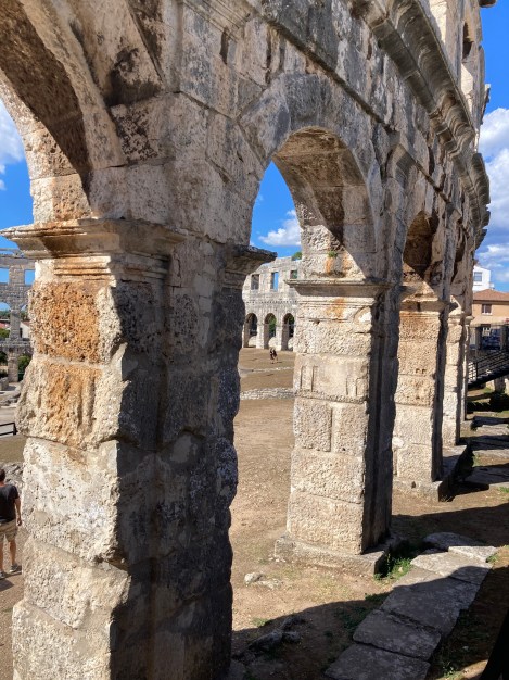 I got to Pula around 3:30pm, parked by the harbor, and then found a shady spot near a park. The first thing I saw? That magnificent Roman amphitheater. I walked around but didn’t go in, then checked out a nearby archaeological exhibit on caves, which was actually really cool.