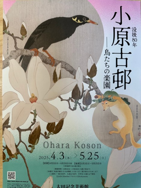 I wandered around, taking a plethora of photos as I walked through the brilliant azaleas. There were others on the trail photographing the spectacle, and I appreciated that each person politely waited their turn before doing their photo shoot. I liked walking on the less known trails in the to the shrine where I said a prayer for peace, particularly in the context of Trump’s exploits (I would pray for a variation of this at every shrine and temple I encountered on my trip). From there I passed the offerings to the shrine of a huge pile of saki and wine barrels on either side of the path, then headed out of the grounds to the Ota Memorial Museum of Art which featured 120 breathtaking woodblock prints of Ohara Koson, mostly of birds. The exhibit was aptly titled “A paradise for birds”. Koson (1877-1945) was a flower and bird artist active from the end of the Meiji period to the early Showa period. He painted birds, flowers, and animals using traditional ukiyo-e woodblock print techniques inherited from the Edo period. He portrays birds and other animals with a warm gaze. I marveled at the prints filling the gallery’s first and second floors. I especially loved his image of a fox with a leaf on his head.