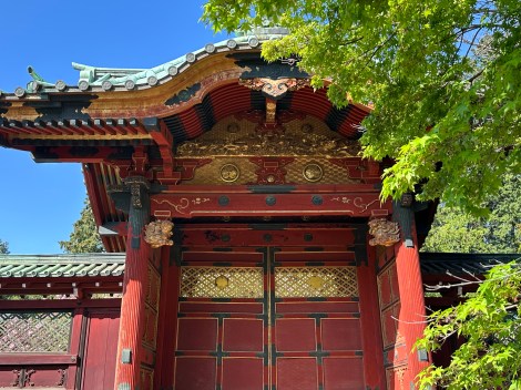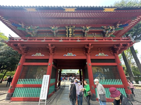 We visited several of the 14 or so Buddhist temples within blocks of the train station. Two stood out: Gyokurinji with its statue of legendary Sumo wrestling Yokozuna champion Chiyonofuji and Myokoji with its beautiful grounds and stately conifer marking the crossroads. Noriko loved that tree and remarked on its permanence. Around the corner she pointed out Art Sanctuary Allan West (Allan West’s studio and gallery), which she loved for its ambience as well as art. On the way to Asakura Museum of Sculpture, she pointed out a few more temples and a preserved section of the Edo earthen city wall. The wall, built during the Edo period (1603-1868), was a remnant of the defensive structures that once surrounded Tokyo. We reached the sculpture museum and Noriko exhorted us to return and check it out. We wound through the neighborhood and Yanaka cemetery, a bucolic spot filled with beautiful trees, toward Nezu Shrine. At Nezu Noriko bid us farewell, as she had work to do. The Bunkyo Azalea Festival was in full-swing, with all 100 species of the 3,000 azaleas in full bloom. The shrine was full of people waiting to view the colorful bushes close up, while others strolled around the grounds or waited in a long queue to pray at the shrine. I walked through the closely stacked vermillion Torii gates, arriving at the Otome Inari Shrine. There I saw that one of the fox guardian statues had a baby fox! Below the Torii gates was a small pond full of lively carp eager for a snack. It was a lovely day, and the place was packed.