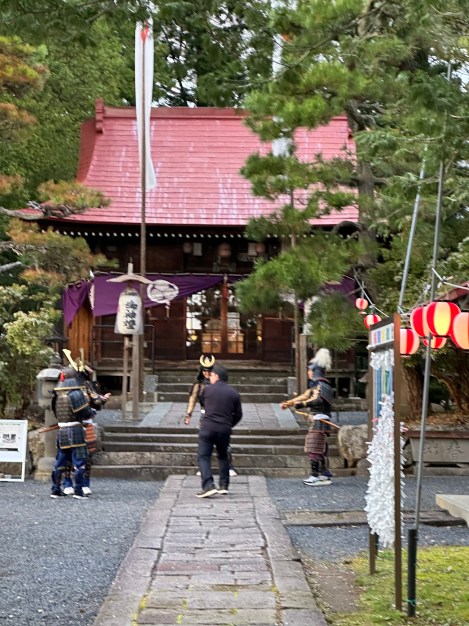 It was a beautiful day and I continued walking south along the hills, through an old cemetery and a rogue vegetable patch along the road where someone was growing eggplant. I found a very chic country inn and restaurant further on, and wondered what it would be like to stay there. Turning back, I headed back to the reconstructed keep of Kaminoyama aka Tsukioka Castle, where some young men were dressed as samurai for a photo session. I wound my way along the path, snapping a few photos of the picturesque hirayama-style castle. I had walked a lot and made my way to the train station, looking forward to sitting down and looking out the window. Shawn was on time and we headed back to Yamagata City to scare up dinner and conk out for the night.